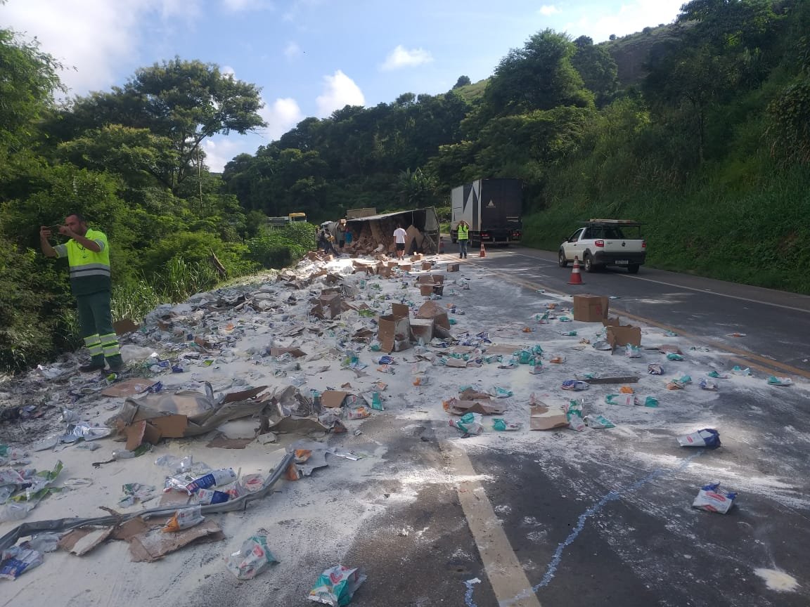 Segundo as primeiras informações, o acidente envolveu uma carreta e um automóvel. Parte da carga ficou espalhada pela pista.
