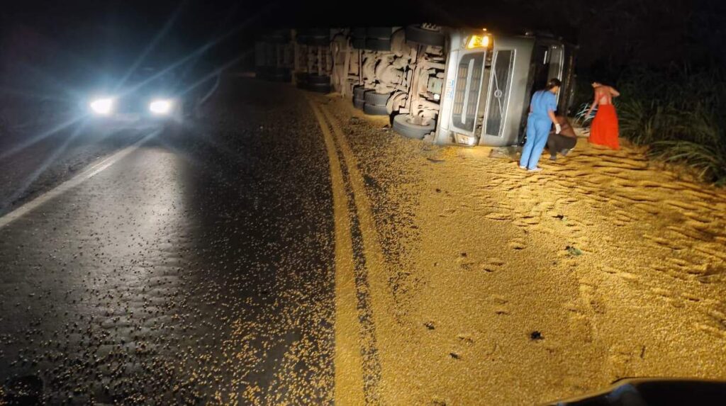 Uma carreta carregada com milho tombou no km 43,9 da BR-262, próximo à ponte do Evaristo, na noite de quinta-feira (04/12). O acidente aconteceu no trecho entre Realeza e Manhuaçu.