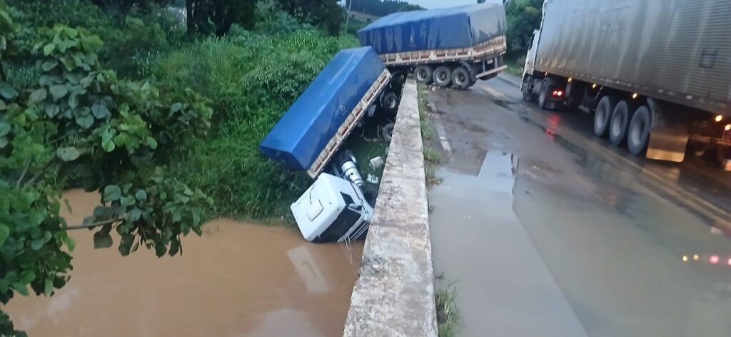De acordo com as informações iniciais, o motorista perdeu o controle da direção ao passar pela ponte, onde havia grande acúmulo de água sobre a pista. Com isso, o veículo acabou saindo da rodovia e ficou dependurado na estrutura da ponte, parcialmente submerso nas águas do Rio Matipó.