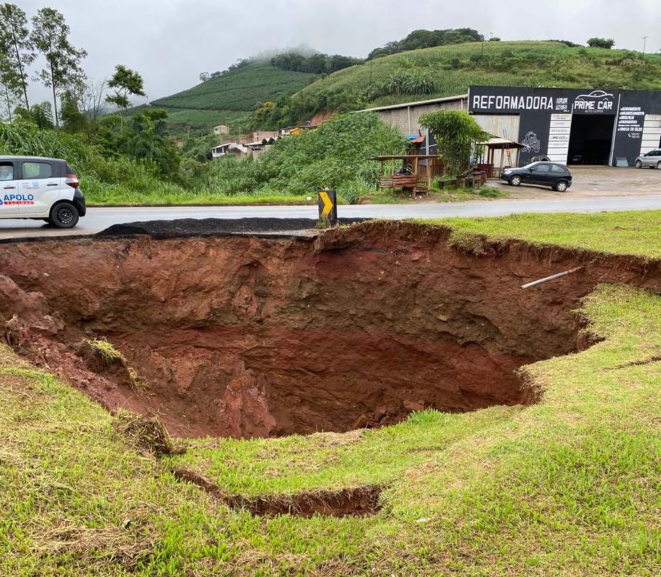 Além do afundamento de grande parte do canteiro central do trevo, a cratera já ameaça a pista da BR-262 no entroncamento com a MG-108 e o acesso da cidade.