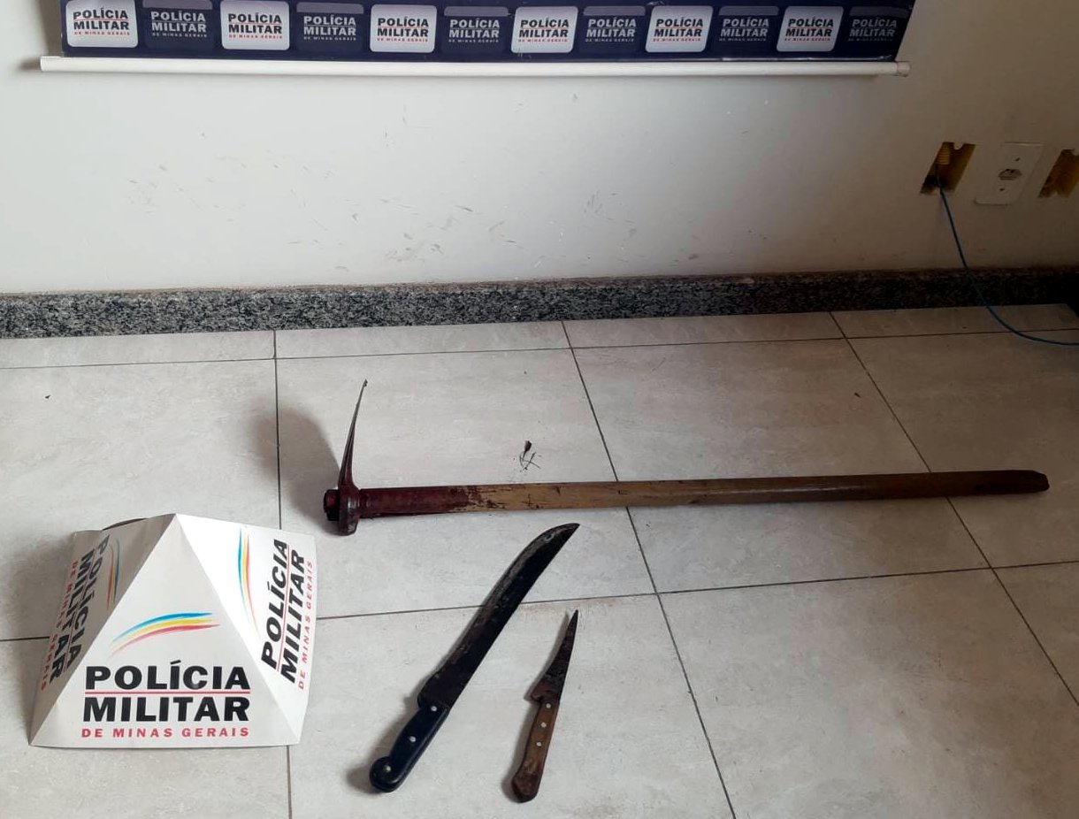 Diante dos fatos o autor, de 54 anos foi encaminhado a Delegacia juntamente com o enxadão, um facão e uma faca que foram apreendidos no local dos fatos.
