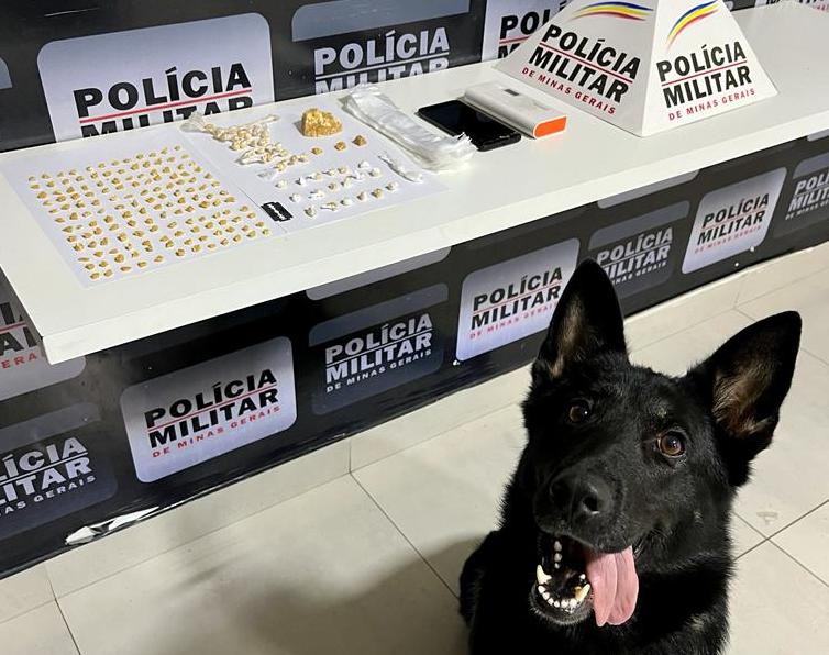 Foram realizadas buscas no interior da residência e nos fundos da casa onde, com a ajuda da cadela de faro Kakau, foram localizadas 194 pedras de crack, sendo 50 já embaladas para venda, 03 pedras médias e 01 pedra bruta da mesma droga, 02 papelotes de cocaína, um aparelho celular e materiais comumente utilizados para embalar drogas.