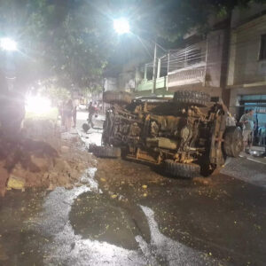 Um caminhão carregado com sacos de ração para porcos tombou na rua Pedro Faria, no bairro São Jorge, na noite desta quarta-feira, 17/04.