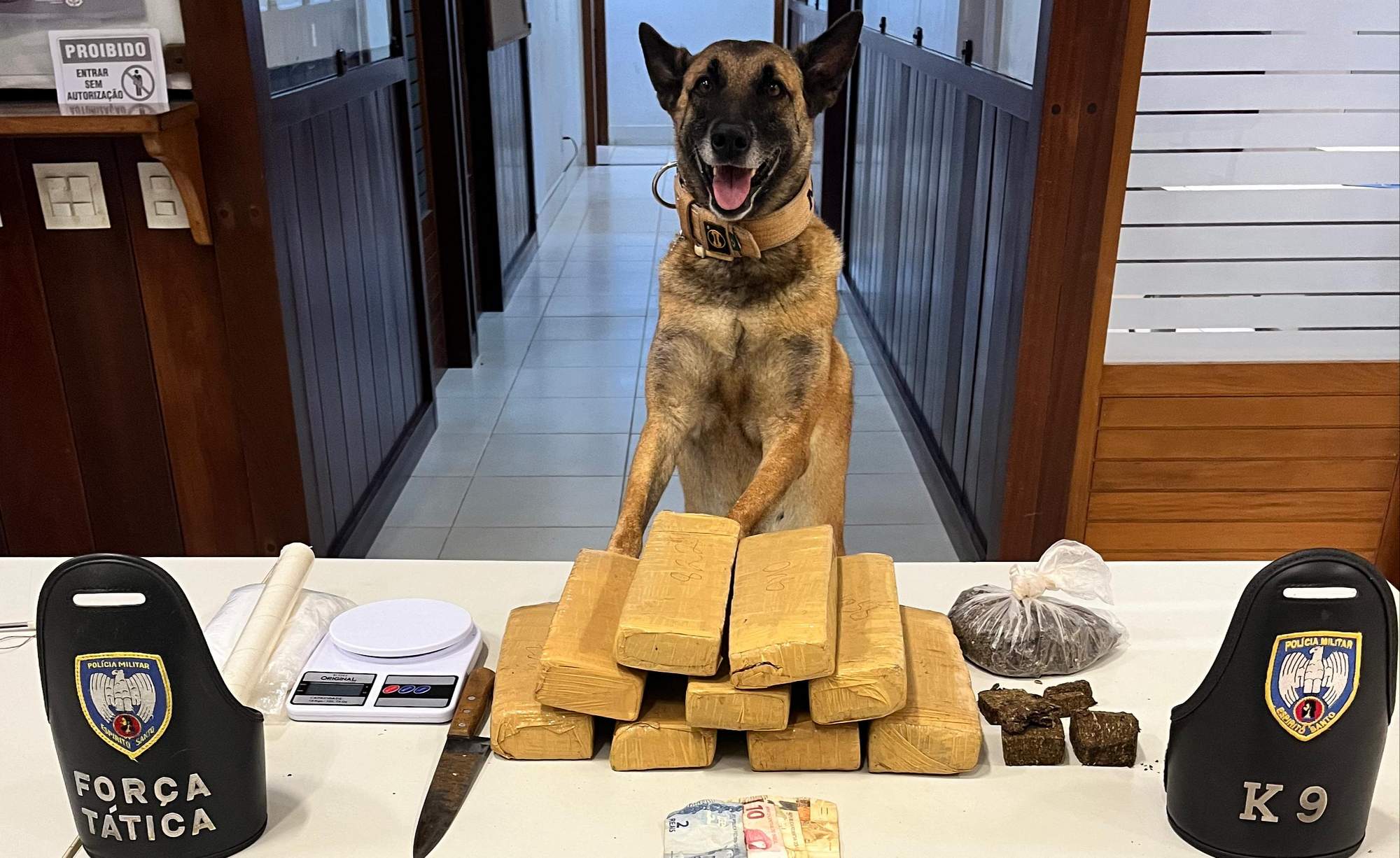 Na residência, foram apreendidos nove tabletes de maconha, uma balança de precisão, uma faca, seis pedaços menores da droga e uma quantia de R$ 112,00.
