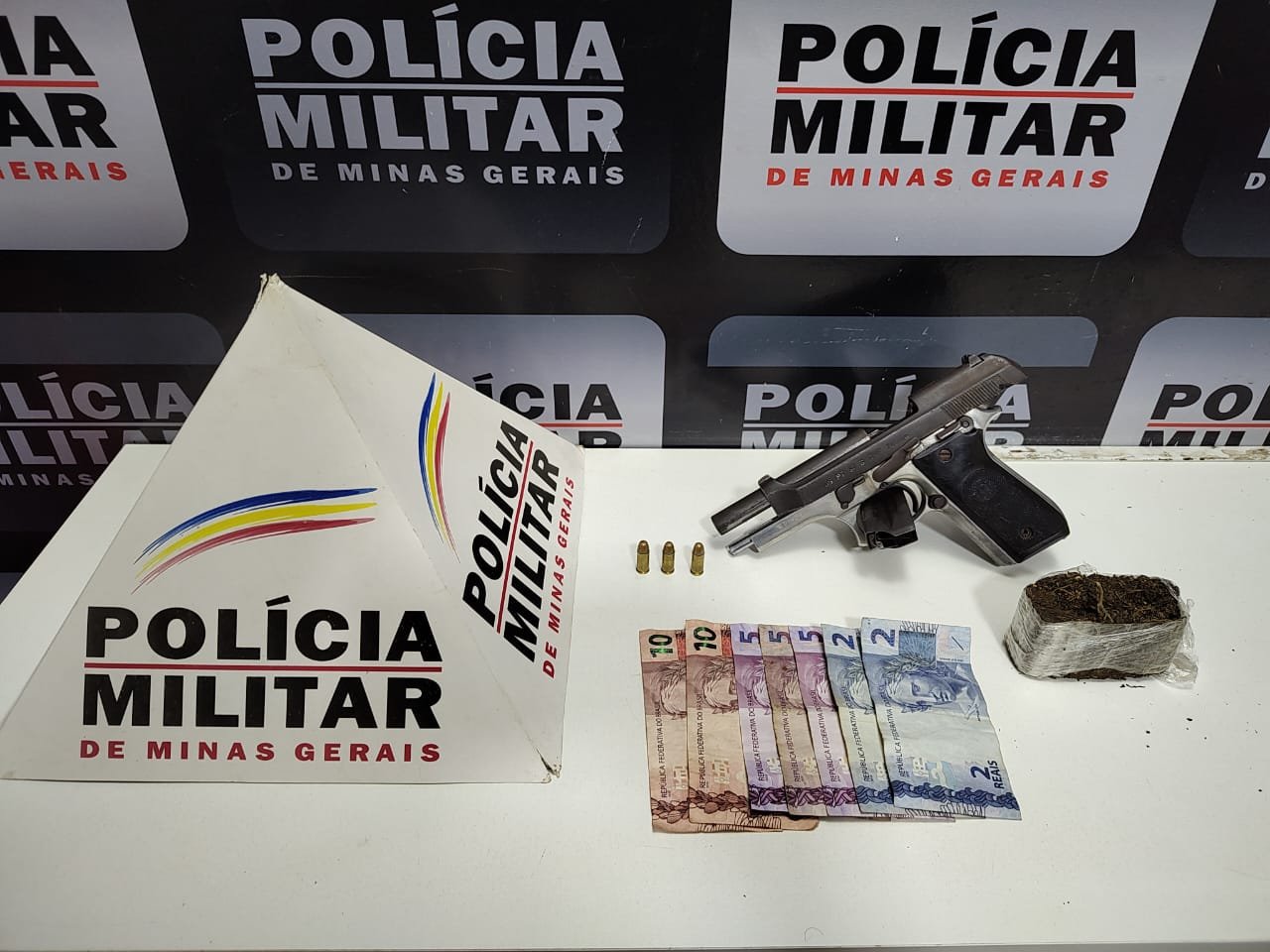No local, o autor ao perceber a aproximação dos militares tentou esconder algo. Ele foi abordado e durante as buscas foram localizadas 01 arma de fogo, tipo pistola calibre 765, com carregador e 03 munições intactas do mesmo calibre, meia barra e 02 buchas de maconha, além de R$37,00.