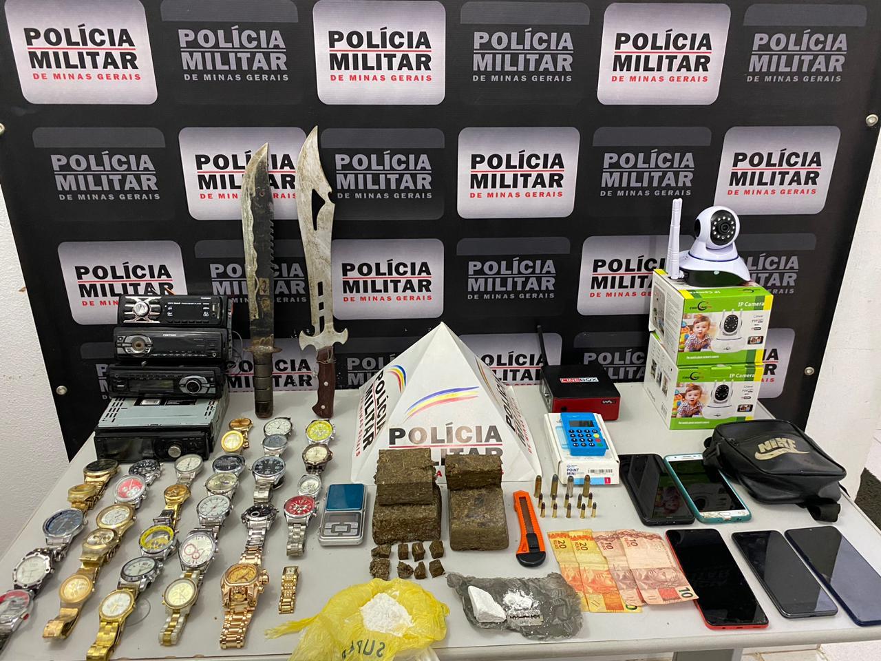 Na residência do autor foram localizadas ainda produtos ilícitos, sendo encontrados ao todo 04 tabletes e 08 buchas de maconha, 01 pedra e 01 bucha de cocaína, 10 munições calibre 22, 04 calibre 38, além de 27 relógios, máquina de cartão, aparelhos de som automotivo, balança de precisão, R$70,00, 02 facões, 02 câmeras de segurança, 05 celulares e diversos materiais utilizados para preparo e comercialização de drogas.