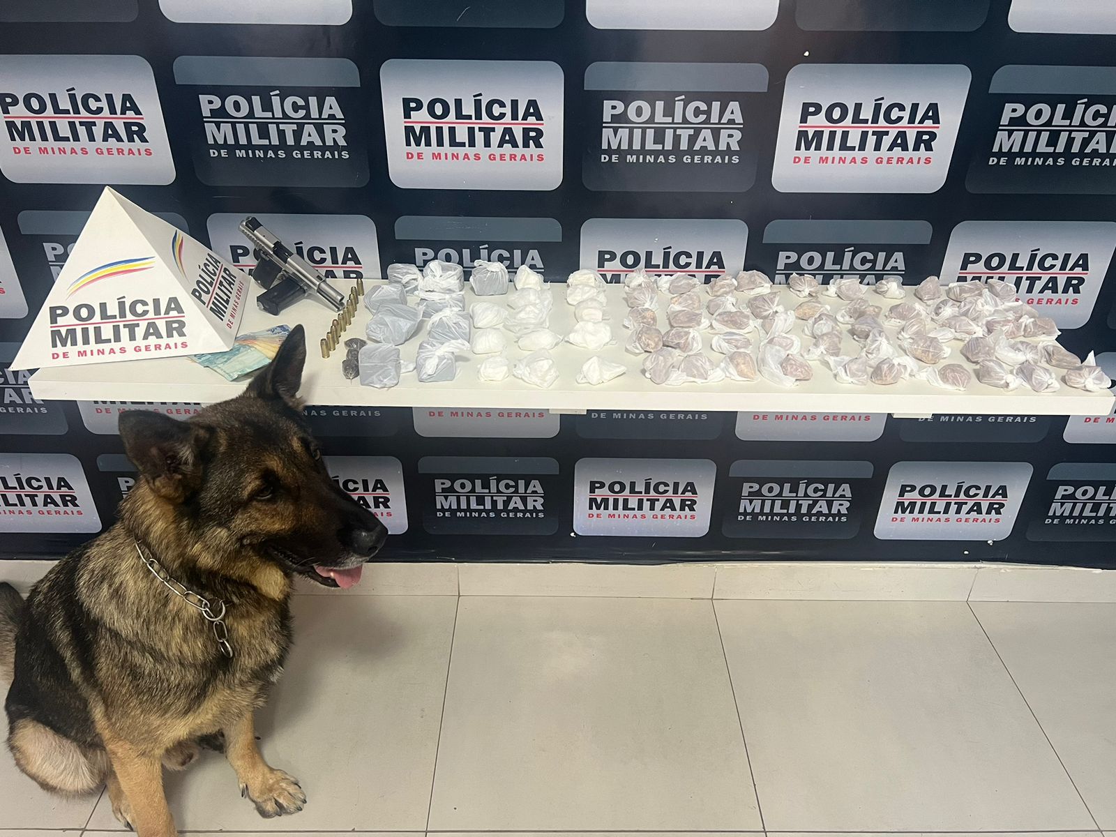 No local durante as buscas foram localizadas 01 arma de fogo, tipo pistola calibre .40, com um carregador contendo 10 munições do mesmo calibre, 50 pedras de crack, 09 tabletes e 03 buchas de maconha, além de 13 papelotes de cocaína.