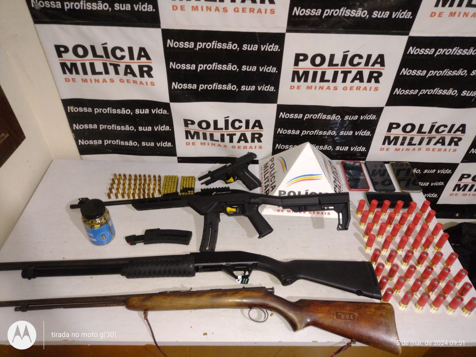 Durante as buscas, com apoio da equipe PM de Rondas Ostensivas com Cães (ROCCA), foi aplicada a cadela de faro Kacau, que localizou 04 armas de fogo, sendo 02 rifles calibre 22, 01 espingarda calibre 12 e 01 pistola calibre 9 mm, além de 03 carregadores calibres 22 e 09 mm, 99 munições 9 mm intactas, 38 deflagradas, 47 munições calibre 12 intactas e 01 deflagrada e 485 munições calibre 22.