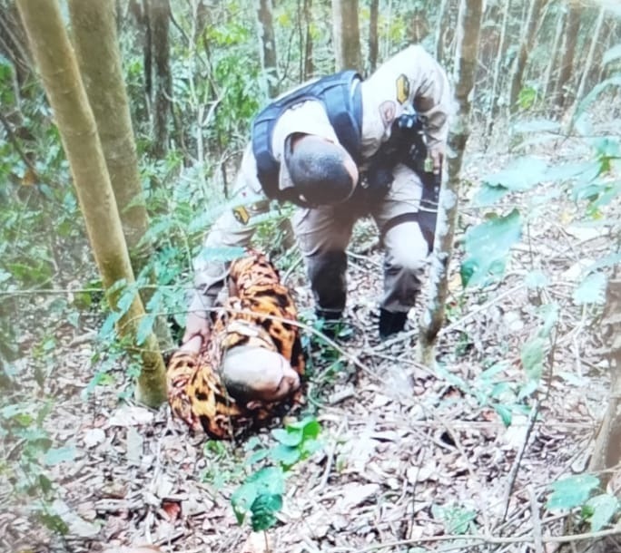 Na ocasião, os militares foram acionados para atender a uma ocorrência de homicídio dentro de uma residência. Ao chegarem ao local, confirmaram o óbito de um homem, que havia sido estrangulado pelo próprio primo. Após o crime, o autor que possui histórico de surtos psicóticos fugiu em direção a uma área de mata portando uma foice.