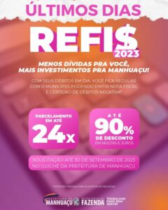 Contribuintes de Manhuaçu que estão em débito com o município tem até o próximo dia 30 de setembro para quitar seus tributos em atraso, ao fazer a adesão ao Programa de Recuperação Fiscal, o Refis 2023. Os descontos são de até 90% do valor acumulado de juros e multas, e o pagamento poderá ser parcelado em até 24 vezes.